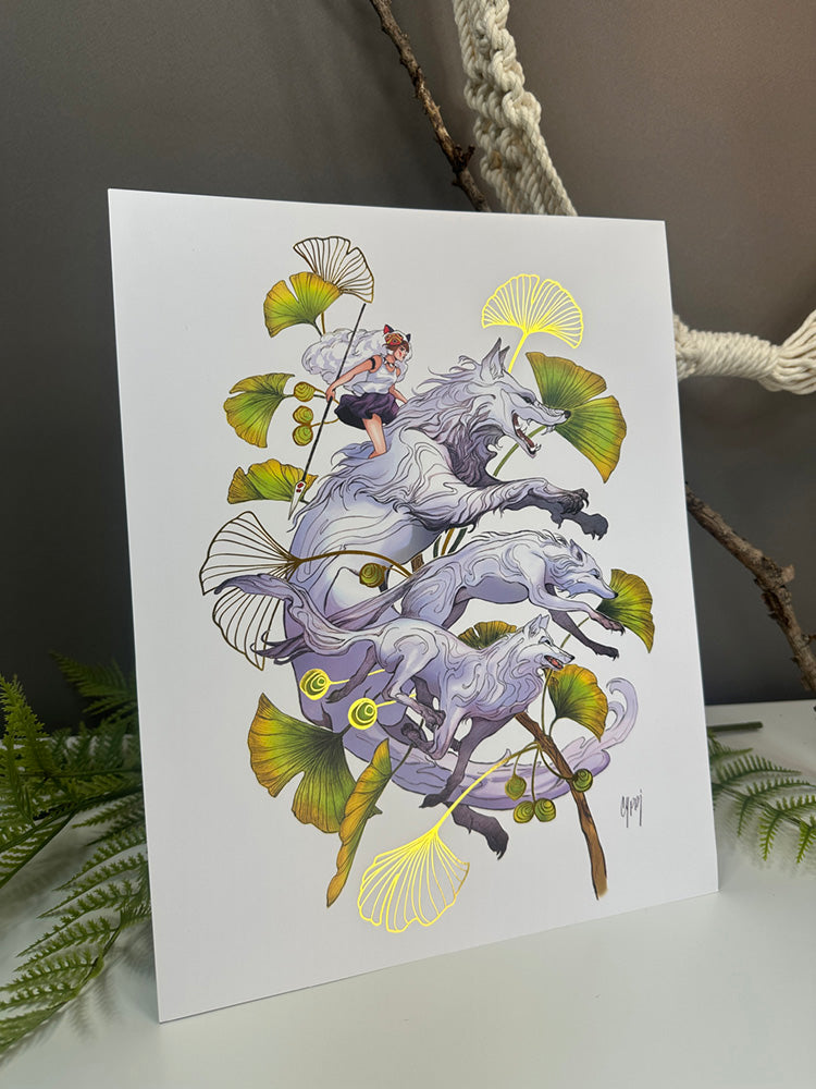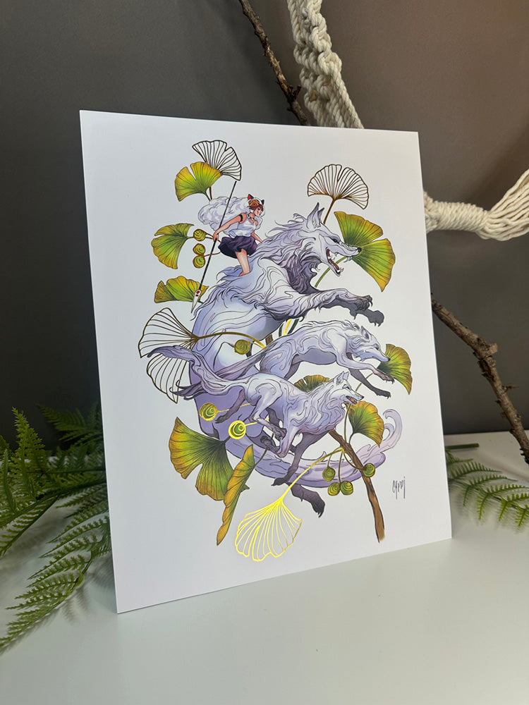 Princess MononokeDigital laser print on 13pt matte coated cardstock paper. Full bleed 11 x 14 inches (28 cm x 35.5 cm) with gold foiling accents. Art by Cypritree